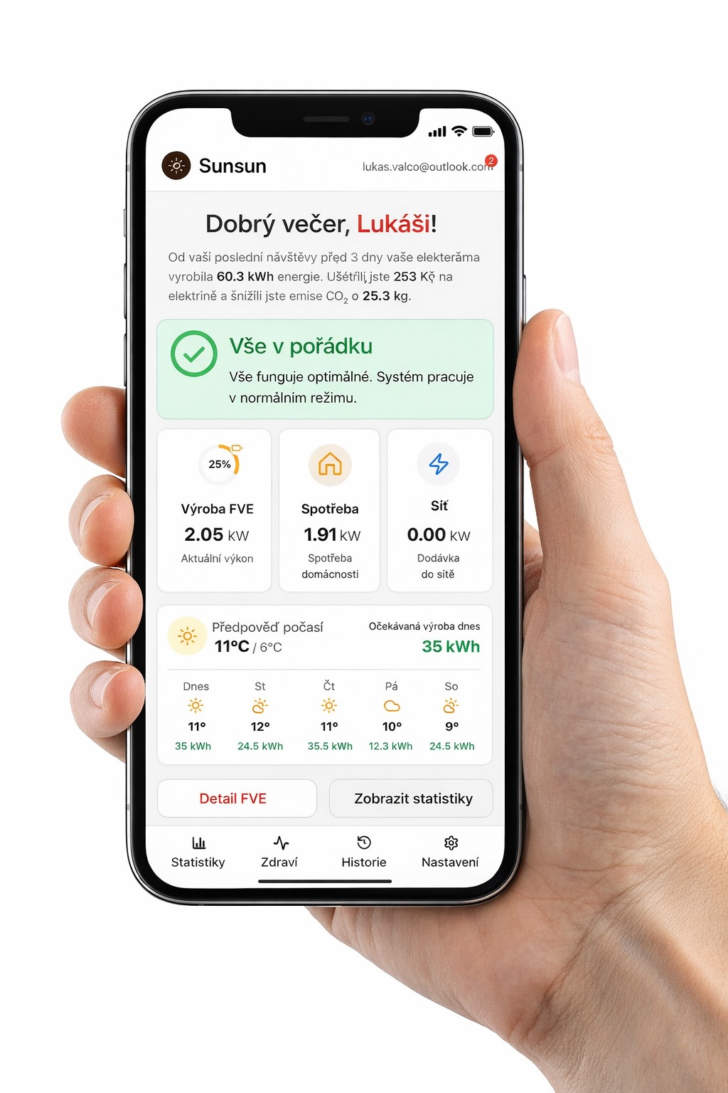 Naše mobilní aplikace vám poskytuje kompletní přehled o vaší fotovoltaické elektrárně. Sledujte výrobu, spotřebu a úspory v reálném čase, přímo z vašeho telefonu.